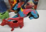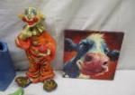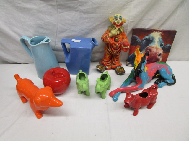 This miscellaneous assortment of home decor items includes a 9" X 9" canvas print of a cow, a wonderful red ceramic cow milk pitcher, two Home Essentials green elephant milk pitchers, a vintage paper mache clown, a multi-color Great Dane dog figure, two ceramic pitchers and more. The two tall pitchers do have chips on the rims. The other items are in used, good condition. Please preview.