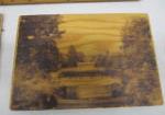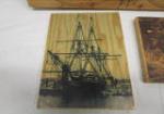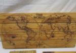Three wooden wall art pieces featuring a 24" X 12" Marmont Hill world map that is laser engraved on planks of pine wood. Also included are two 11" X 8" wooden pieces of wood with decoupaged scenes (including the Constitution). The map piece is in good condition. The other two items are in used condition. Please preview.