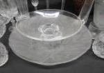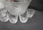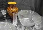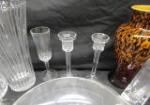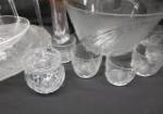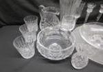 Large collection of glassware including an Anchor Hocking Jubilee punch bowl with six glasses, a baccarat style 8" vase, a vintage glass pitcher, a Waterford Crystal Comeragh footed bowl, a Stuben scroll footed low bowl, glasses, a pair of Waterford Lismore candle sticks, an 11" Mikasa fluted vase and more. These pieces are in good condition. Please preview.