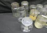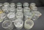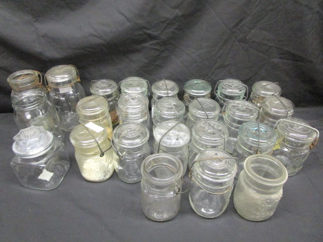This large collection of over twenty vintage glass canning jars, with wire bail closures include Ball and Atlas brands. Also included are three jars without lids. These items are in used, good condition. Please preview.