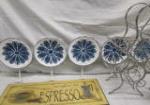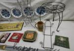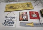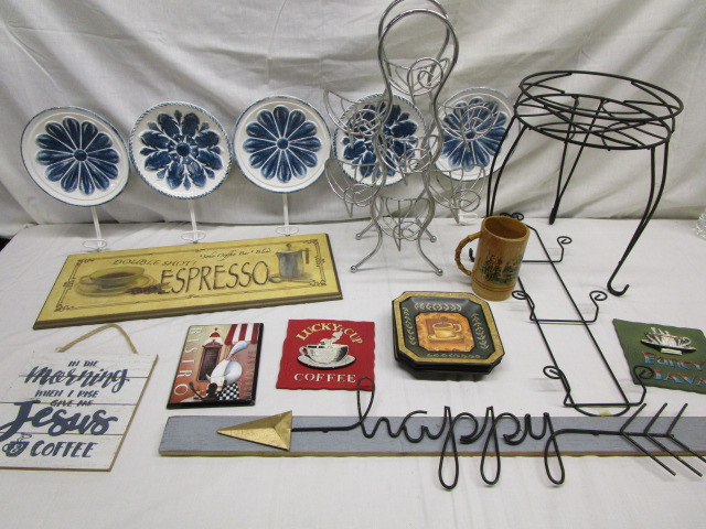 This large selection of home/kitchen decor includes a silver tone wine rack, a 28"W wood and metal "Happy" sign, a 37" coat rack featuring five faux dishes with hooks, a 20" Expresso sign and more. These items are in used, good condition. Please preview.