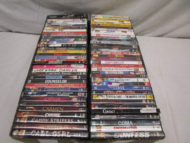 This assortment of 70 DVDs from a variety of genres features a variety of titles including "Contact", "Carrie", "Clueless", "Click" and more. These items are in used, good condition. Please preview.