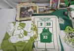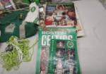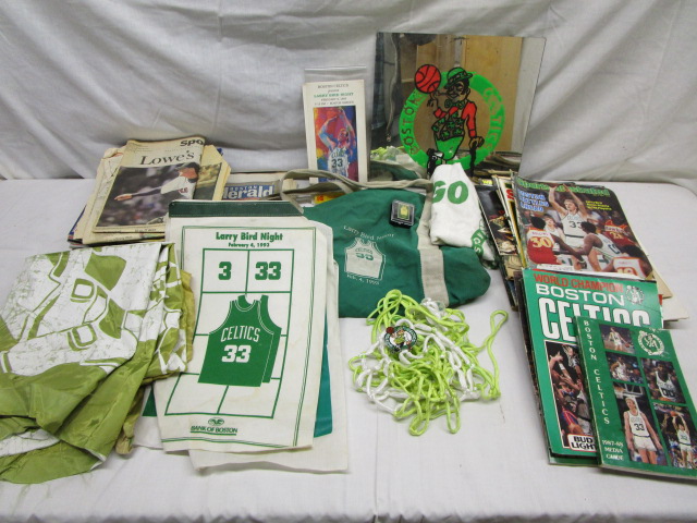 This assortment of Patriots, Red Sox, Celtics, and Larry Bird memorabilia includes a rally towel, a Larry Bird Night canvas souvenir bag from 1993, a Boston Celtics flag, banners and a collection of over thirty sports magazines showcasing Boston sports teams. These items are in used, good condition. Please preview.