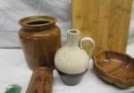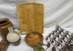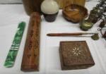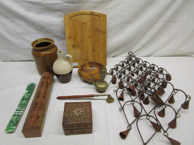 This eclectic assortment of home/garden decor includes two bell style wind chimes, an incense burner,, a small carved wooden box, a wooden bowl, and more. These items are in used, good condition. Please preview.