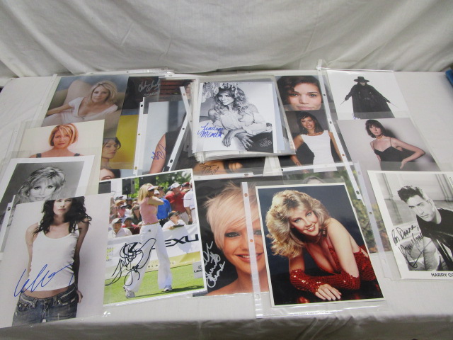 Large collection of 54 publicity photos featuring models, film stars, TV stars, sports figures and adult film stars. This particular collection includes nineteen autographed photos with their COA, thirty-three autographed photos without their COAs and two unsigned photos. Featured celebrities include Heather Locklear, Laura Croft, Harry Connick Jr., Lena Headey and more. Please preview.