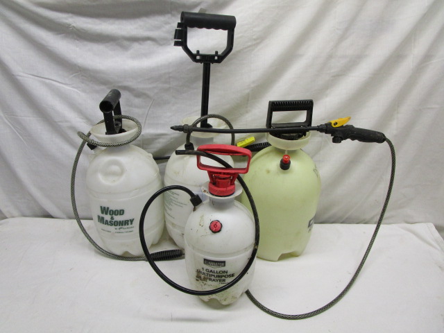 Three 2-gallon pump sprayers (2 Wood & Masonry and 1 Deck & Home) and a 1-gallon multipurpose sprayer. Please preview.
