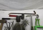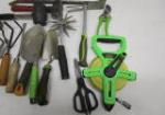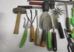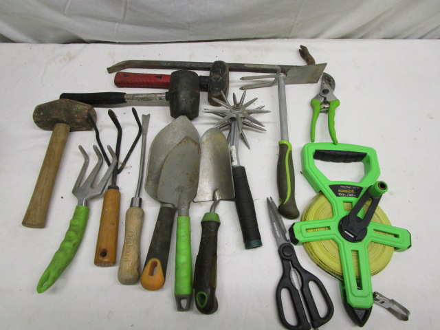 Garden tools and other tool lot including some garden trowels, a 100ft tape measure, mallets and more. Please preview.