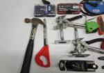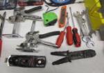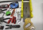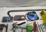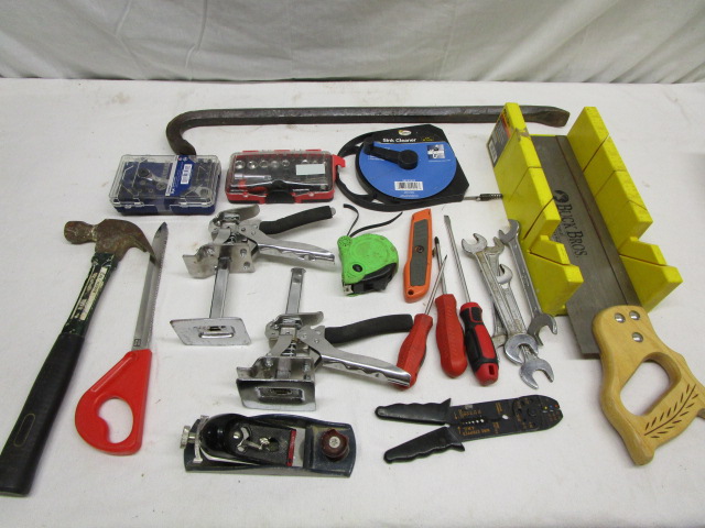Tool tray lot including a pair of handheld lifting tool jacks, a miter box with saw, screwdrivers, a wood plane and more. Please preview.