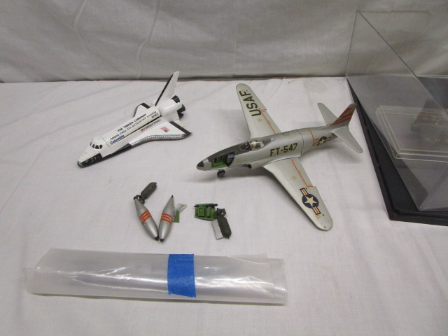 An Ertl diecast model of the Columbia shuttle measuring 7" long and a model of a US Air Force FT-547 jet that is partially built. No instructions included so unknown if all the pieces are there. The AF jet is 9" long. Also includes a display case. Please preview.