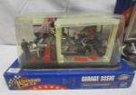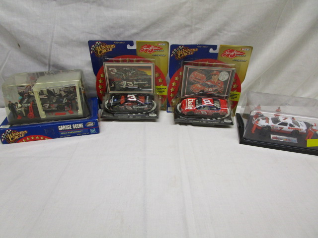 Lot of 4 diecast racing cars. Includes 2 Winner's Circle Art Print Series of Dale Earnhardt's Goodwrench car and Dale Earnhardt Jr's Budweiser car both in original packaging, a Winner's Circle Dale Earnhardt Garage Scene in original packaging, and a Racing Champions Hooters garage scene not in original packaging. Please preview.