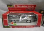 Lot of 3 diecast cars and 1 plastic car. Includes a Maisto '94 Mustang GT (1/24th) in original box, a Revell Mercedes 300 SL (1/24th) in original box, a Welly Dodger Charger Daytona R/T, and a plastic 2005 Corvette with a missing side mirror. Please preview.