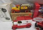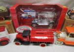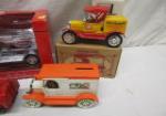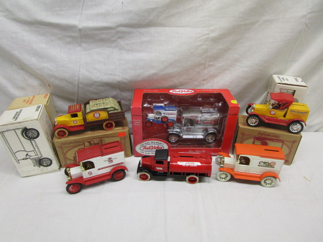 Lot of 7 Ertl diecast metal banks in their original packaging. Banks include a 1925 Kenworth (1/34th), a Ford Model T (1/25th), a 1913 Ford Model T Quality Farm and Feed panel truck (1/25th), a 1917 Model T Cr's Friendly Markets delivery van (1/25th), a 1931 Hawkeye Tanker (1/34th), a 1913 True Value Model T (1/25th), and a 1913 True Value Model T (1/43rd). Please preview.