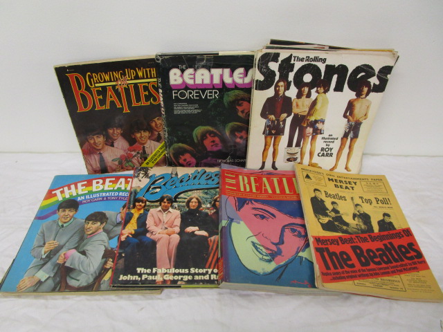 This nice assortment of eight Beatles and Rolling Stones related, hardcover and paperback books includes "Growing Up With The Beatles", "The Beatles Forever", "The Rolling Stones" (an illustrated record) and more. These books are in used, good condition. Please preview.
