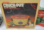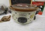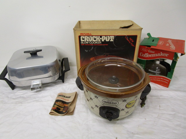 This collection of three kitchen appliances includes a Sunbeam electric fryer, a Crock-Pot slow cooker, and a Melitta "pour over" coffee maker. These items are in used, good condition. The electric fryer is missing its cord. Please preview.