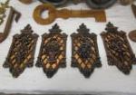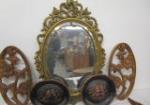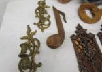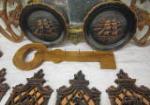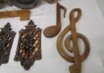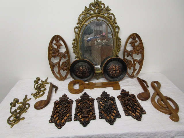 This assortment of vintage and mid-century faux metal and wooden home decor items include wooden musical notes, four matching crest style wall decor pieces, a pair of Copper Craft style ship plaques, a large gold toned mirror and more. These items range in size from 10" to 27". These items are in vintage, used, good condition. Please preview.