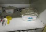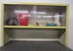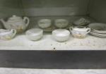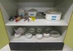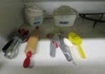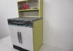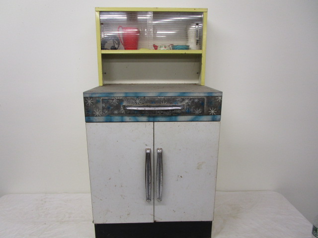 This adorable vintage child's metal kitchen cabinet features play cookware, utensils and a tea set. This set measures 18"W X 14-1/2"D X 36"H. This item does have some rust due to age. Please Preview.