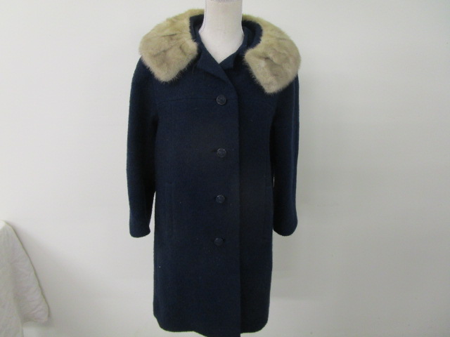 This gorgeous vintage Craigleigh blue wool coat (size small) with a natural fur collar and beautiful rose style buttons is in used, good condition. Please preview.