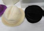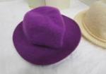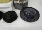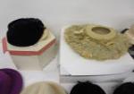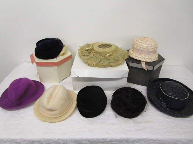 This collection of eight vintage hats and three hat boxes includes three formal black velvet pill box hats, an angora and acrylic purple hat, and more. These hats are in used, good condition. Please preview.
