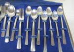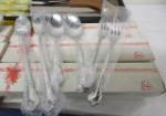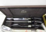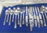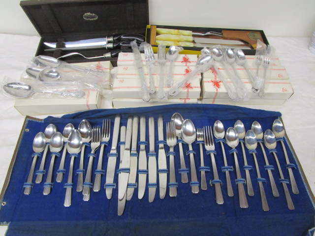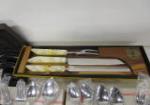 These two partial sets of flatware include a Rogers A1 Plus Oneida Limited (possibly the Meadowbrook pattern) and a partial set of Gorham style flatware. Also included is a Flint Hollow Ground carving set, and a Laguiole-style carving set. These partial sets include ice tea spoons, cocktail spoons, dinner forks, salad forks, soup spoons, fountain spoons, serving spoons and more. These items are in used, good condition. Please preview.