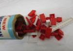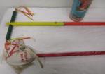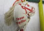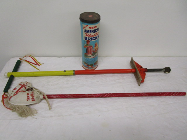 These nostalgic items include a “Texas Stallion” hobby horse toy, a child’s size Pogo stick and a can of “Halsam” brand American Plastic bricks. These items have been well loved and are in used condition. Please preview.