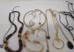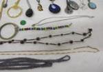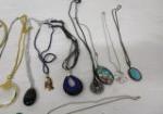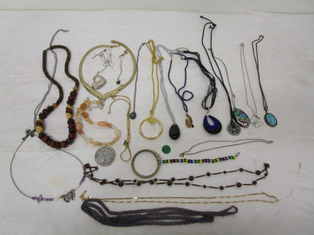 This selection of twenty pieces of jewelry includes necklaces, earrings, and pendants. This lot features a lovely locket with a gem stone, a silver toned pendant necklace with a clover-shaped pink crystal, a vintage Native American silver polar bear pendant/pin featuring mother of pearl and more. These items are in good condition. Please preview.