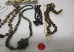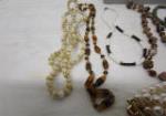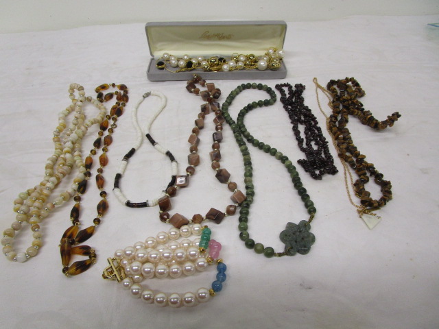 This collection of ten lovely necklaces includes beads, pearls, a green stone, beaded necklace with a carved pendant, and more. These items are in used, good condition. Please preview.