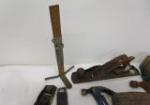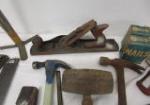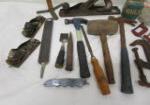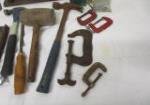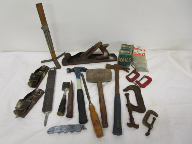 This assortment of sixteen vintage hand tools includes a mallet, hammers, clamps, planes, chisels and more. These tools are in used, good condition. Please preview.