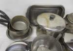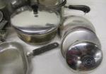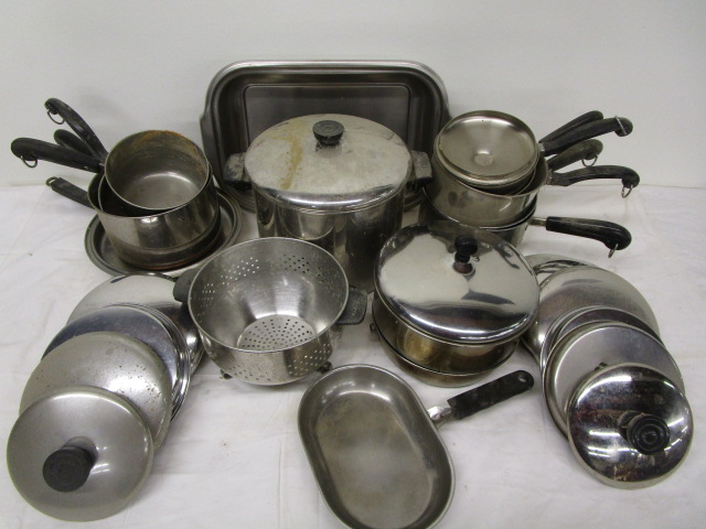This large collection of pots and pans (some with lids) includes sauce pans, pasta pots, simmering pans, fry pans roasting pans and more. These items are in used, good condition. Please preview.