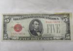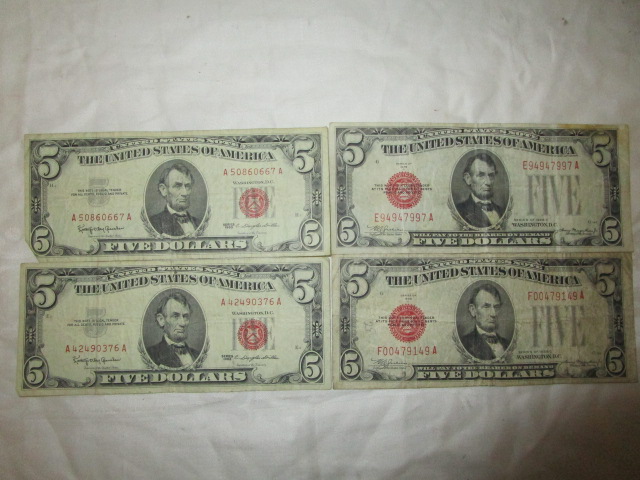This selection of four Red Seal 5 dollar legal tender notes includes (2) 1928 C, and (2) 1963. These items are in circulated condition. Please preview.