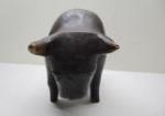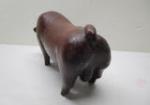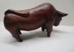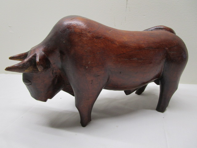 This gorgeous 12-1/2"L X 8"H Mid-Century hand-carved teak bull sculpture is in previously owned, good condition. Please preview.
