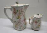 This darling vintage 9" Mikori Ware hand-painted floral coffee/tea pot and large and a smaller pitcher/creamer are in previously owned condition. There is a crack in the lid of the large pitcher. Please preview.