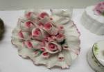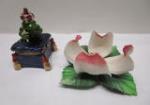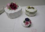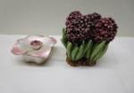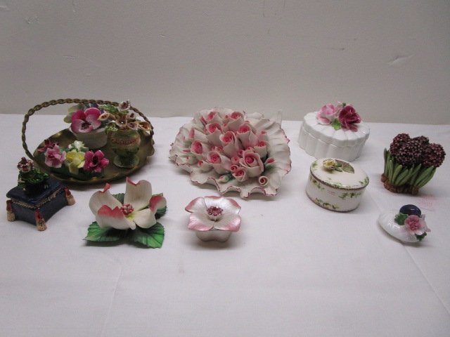 This nice collection of ten floral decor pieces includes an 8" piece of Italian Capodimonte porcelain featuring a bouquet of roses, an interesting "Hyacinth" trinket box from the Harmony Garden collection by Harmony Kingdom, a Limoges trinket box, 2-1/2" Crown Staffordshire figurine of a basket of pansies. a jeweled enamel Calla Lily trinket box and more. These pieces are in good condition. Please preview.