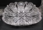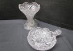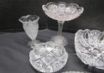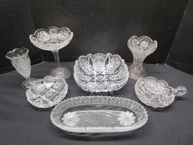 This stunning collection of seven pieces of cut and pressed glass includes a 6-1/2" Westmoreland Paddle wheel vase, a 7-1/2" EAPG Compote dish, a 6" Hofbauer Byrdes style bud vase, an 8-1/2" American Brilliance cut glass bowl, a 11-1/2" celery bowl, a smaller American Brilliance bowl and a Imperial Glass Nucut "Radiant Daisy" handled Nappy dish. These pieces are in good condition. Please preview.