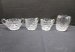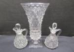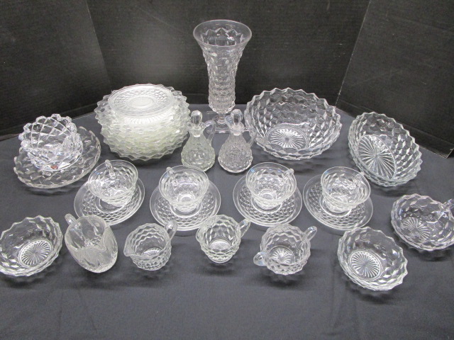 This gorgeous collection of over twenty five pieces of vintage Fostoria American clear glassware includes a 9" bowl, a 9-1/2" vase, seven dessert plates, a footed serving plate, four tea cups, five saucers, two cruets and more. . Also included is a beautiful Orrefors Sofiero cut crystal bowl and a 4" vintage Kristal Zajecar lead crystal pitcher. These items are in good condition. Please preview.