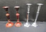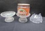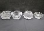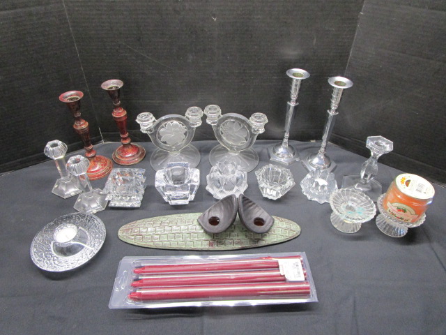This assortment of candle holders including four pairs of candle stick holders and eight candle holders. These items include a pair of 5" Orrefors Globe crystal candle sticks, a pair of Indiana Glass Constellation Grape Frosted double light candle sticks, a Baccarat candle holder, an interesting ceramic Stem African style candle holder and more. These items are in used, good condition. Please preview.
