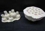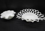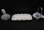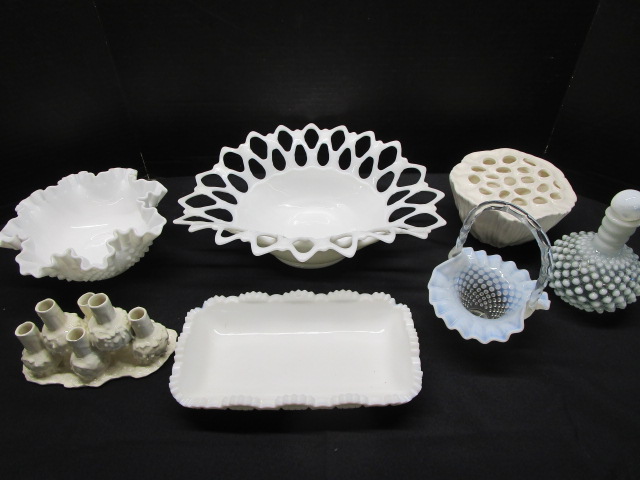 This assortment of miscellaneous milk glass, porcelain, and ceramic pieces includes a Fenton white opalescent hobnail perfume bottle, a white Polspotten style Coral Reef vase, a ceramic lotus flower frog vase , a milk glass hob nail bowl and more. These items are in previously owned, good condition. Please preview.