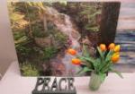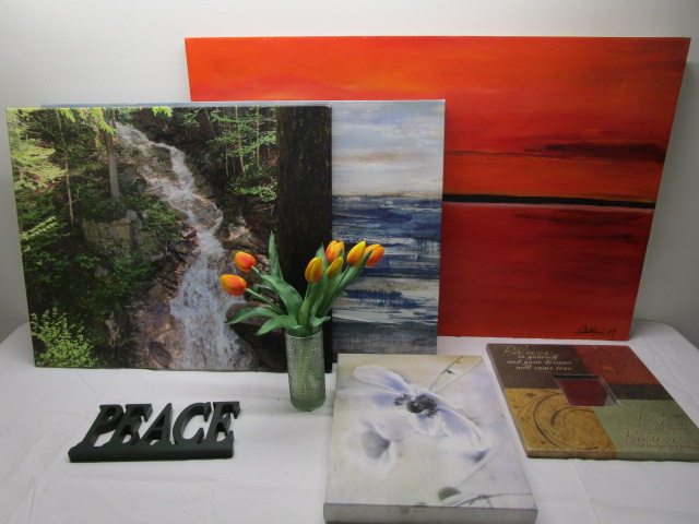 This nice assortment of wall art decor includes four stretched canvas prints/paintings/photos. These canvas items feature a 14" X 11-1/2" print of a flower, a 24" X 20" photo featuring a waterfall, a a 29" X 20" abstract seascape painting, and a 35' X 24" signed, abstract painting of a sunset. Also included is a mirror with a large wooden frame and inspirational quotes. Also included is a wooden shelf Peace (word) sign and a glass vase with silk tulips. These items are in used, good condition. Please preview.