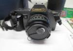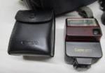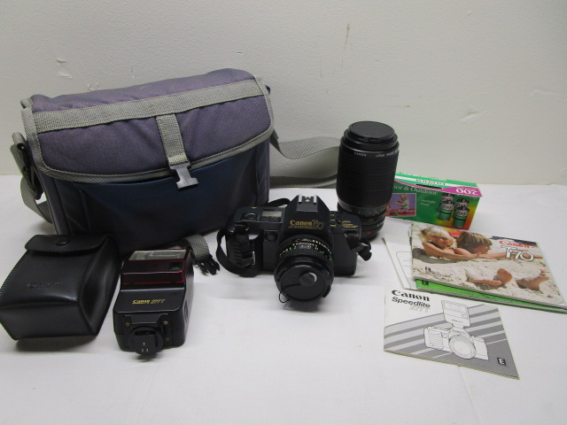 This vintage Cannon T70 camera features an external flash, zoom lens, film and a nice nylon carrying case. This item is in used, good condition. Please preview.