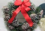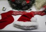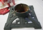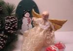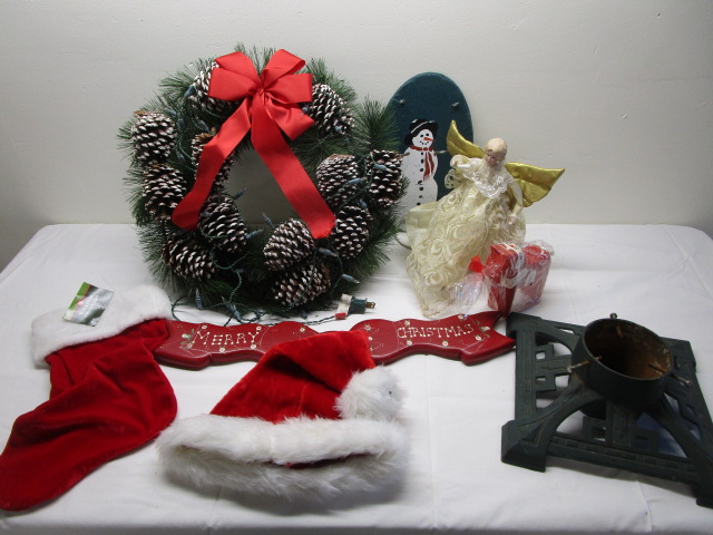 This selection of Christmas items includes a cast metal Christmas tree stand, a vintage porcelain angel Christmas tree topper, a 20" artificial Christmas wreath, a 13" painting of a snowman on slate and a wooden Merry Christmas sign. These items are in previously owned condition. Please preview.