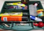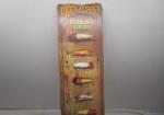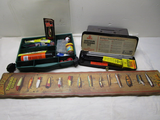 This collection of fishing related items includes a 36" X 5-1/2" fishing lure sign, a Outers brand shot gun cleaning kit (model # P-478), a Taskmaster tackle box, Tackle Logic tackle box with tackle (including lures, bobbers, hooks, weights and more). These items are in used, good condition. Please preview.