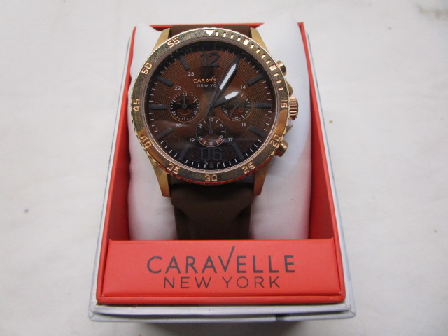 This gorgeous Cavavelle New York by Bulova Men's Chronograph Watch (model # 44A102), features a rose gold -toned case and a brown dial and a brown silicone strap. This item is in new condition in its original box. Please preview.