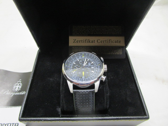 This stylish Burgmeister Melbourne (BM505-122) men's watch features reliable quartz movement from Citizen Miyota, a black leather band and water resistance up to 100 meters. This watch is in new condition in its original box with certificates and information. Please preview.