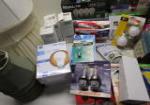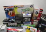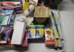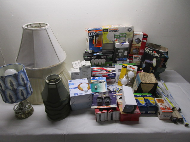 This large assortment of home lighting items includes nine lamp shades (various sizes, styles four matching), a small table lamp, a Mason brand "Weathertite" SiteLight outdoor spot light and a large variety of light bulbs. These items are in new and used, good condition. Please preview.