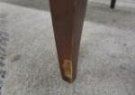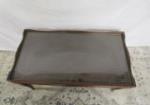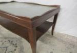 This vintage wooden two-tier console table features dark wood, tapered legs and glass top. This piece measures 31-1/2"W X 18" D X 18"H. This item has some light wear duty to age. It is in previously owned condition. Please preview.