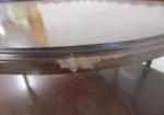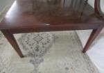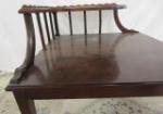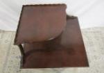 This Early American Mersman style two tier mahogany table features a scalloped upper tier with supporting arms. This piece measures 28-1/2"W X 28-1/2"D X 28-1/2"H. and has legs that can be removed for transport. This piece has a small area of minor damage as seen in the photos. This piece is in previously owned, good condition. Please preview.