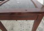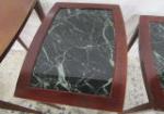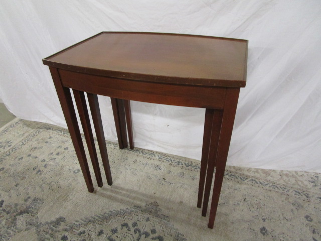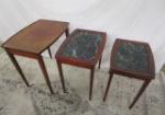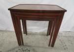 This trio of vintage nesting tables includes a larger table with a plain top and two smaller tables with green marble style glass tops. The largest table measures 22-1/2"W X 16"W X 24"H, the smaller table measures 20"W X 14"D X 22"H and the smallest table measures 18"W X 12-3/4"D X 21"H. These tables are in previously owned, good condition. Please preview.
