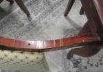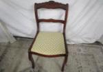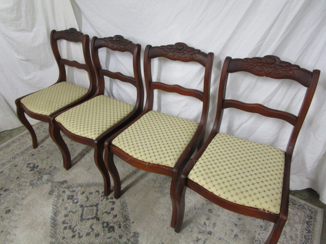 This selection of four Hickory Co. mahogany dining chairs feature a carved rose design and beige fabric diamond pattern. These items measure 12-1/2" W X 21"D X 30"H. These chairs do have some slight areas due to age and the cushion does attached. These items are in previously owned, good condition. Please preview.