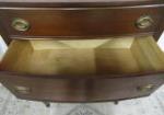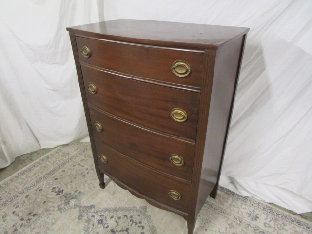 This traditional mahogany bow-front style chest of drawers features four drawers with dove tail designs. This item measures 32"W X 18-1/2"D X 47"H. This piece does have scratches on the top. It is in previously owned, good condition. Please preview.