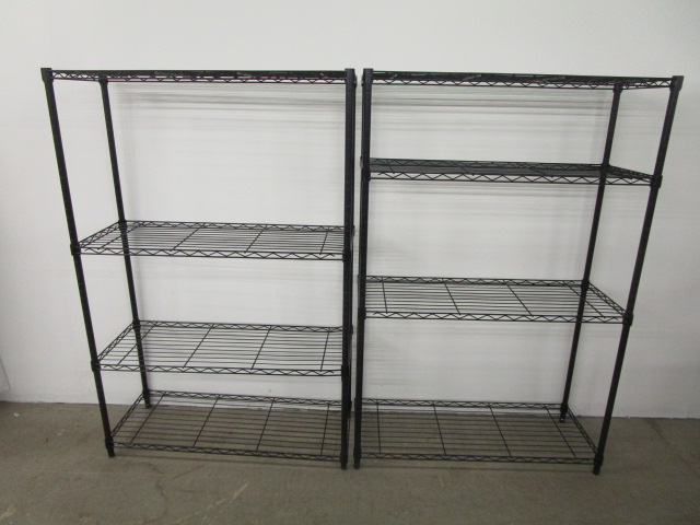 This pair of light weight metal storage shelves feature three adjustable shelves. These shelves measure 35-1/2"W X 12"D X 54-1/2"H. These units are in good condition, however one of the units is missing a pair of plastic shelf hardware. Please preview.