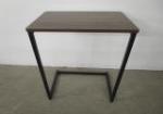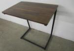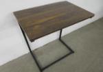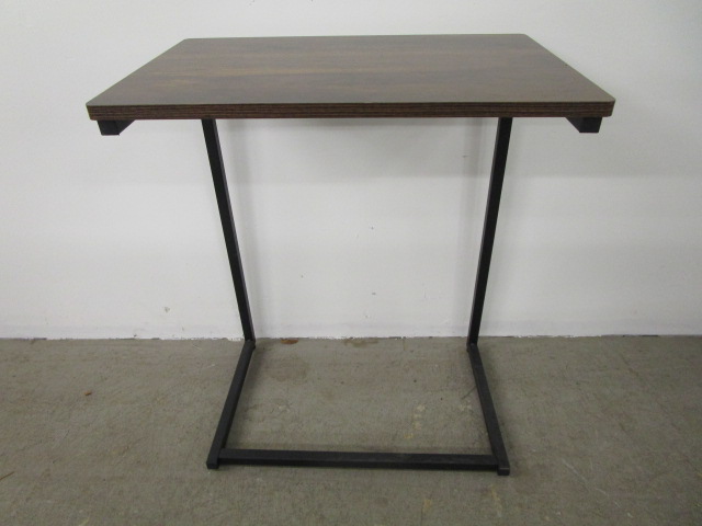 This C-shaped table with dark "faux wood look" top and black metal frame is designed to slide under a sofa or bed. This table measures 22"W X 14"D X 26"H. This item is in used, good condition. Please preview.